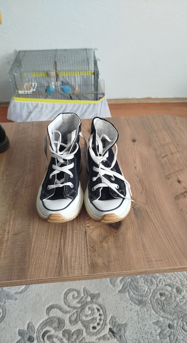 Kadın spor ayakkabıları, dolgu topuk ve kauçuk taban ile athleisure tarzını yansıtıyor. Beyaz ve koyu renk uyumu, rahat ve şık bir görünüm sunar. sorunu yoktur