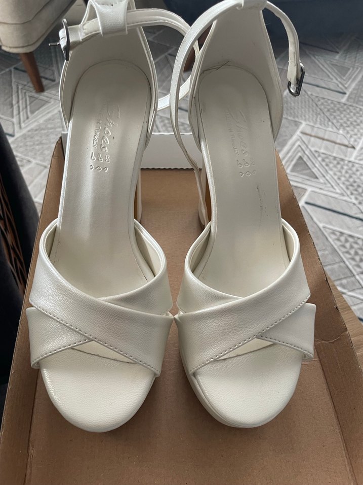 Beyaz dolgu topuklu, tokalı kadın abiye ayakkabı. Suni deri malzemeden,düğünler için uygun. Düğünüm için aldım lakin arka kısım bol geldiğinden hiç kullanmadım sıfırdır topuk yüksekliği 10 cm’dir. Ayak numarası 37 numaradır