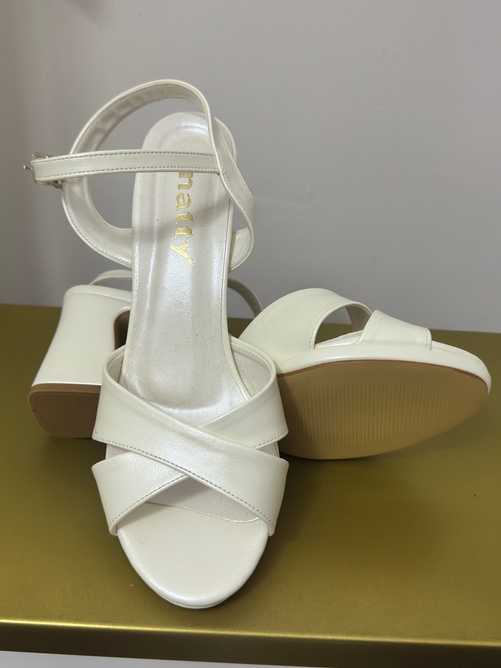 Beyaz dolgu topuklu, tokalı ve minimalist tasarımlı kadın abiye ayakkabı. Kauçuk malzemeden, düğün ve klasik şıklık için uygun.
