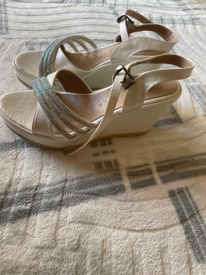 Beyaz dolgu topuklu kadın abiye ayakkabı, tokalı bantlı. Minimalist stile uygun, düğünler için klasik şıklık sunar. Hiç giyilmedi