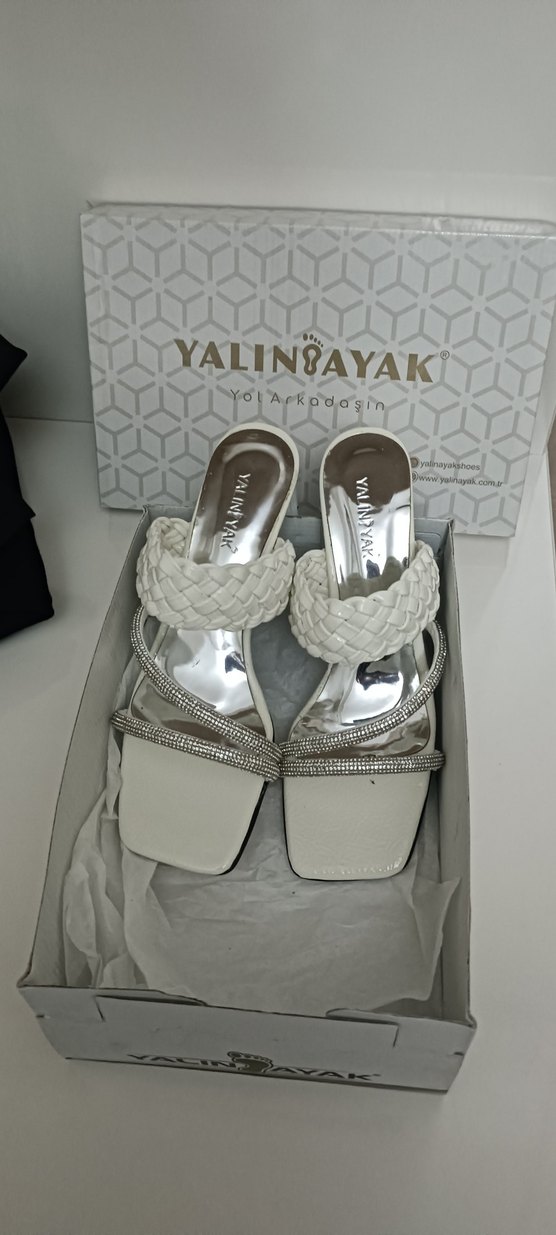 Beyaz dolgu topuklu kadın abiye ayakkabı, yılan desenli ve tokalı detaylara sahip, minimalist ve çağdaş stile uygun. Marka: YALINAYAK. hiç giyinilmedi sıfır beyaz şık terlik
