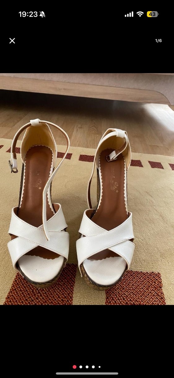 Beyaz dolgu topuklu kadın akşam ayakkabısı, tokalı kayışlı ve minimalist tasarımlı, kauçuk materyalden yapılmıştır. Günlük kullanım için uygundur, bohem tarzda.