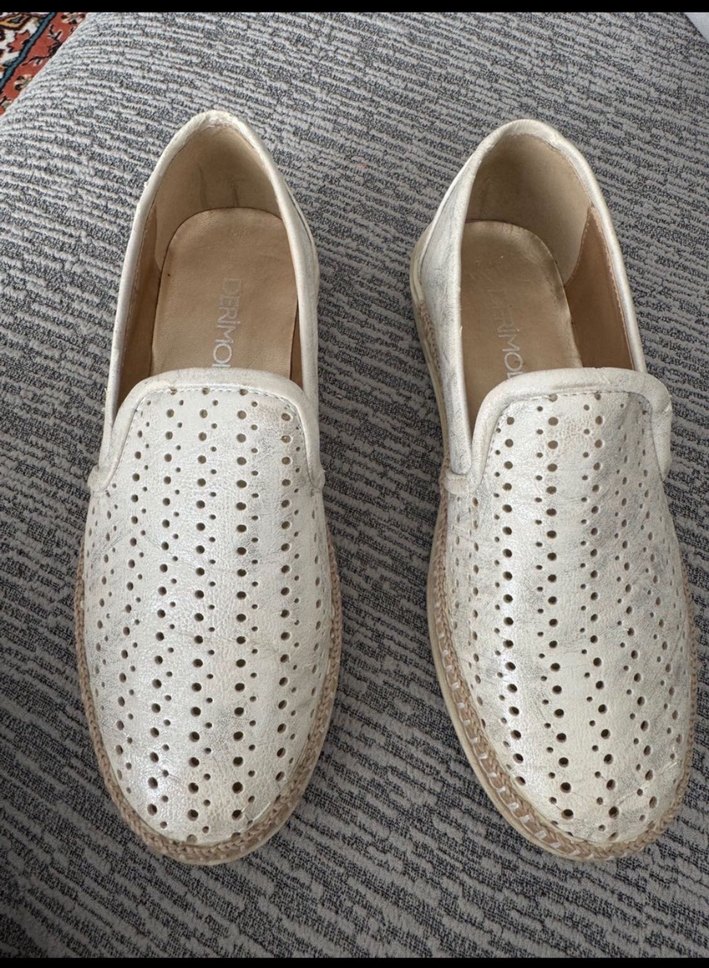 Beyaz renkte, delikli detaylara sahip dolgu topuklu kadın espadrildir. Kauçuk tabanlı, sade ve minimalist normcore tarzındadır, günlük kullanım için uygundur.