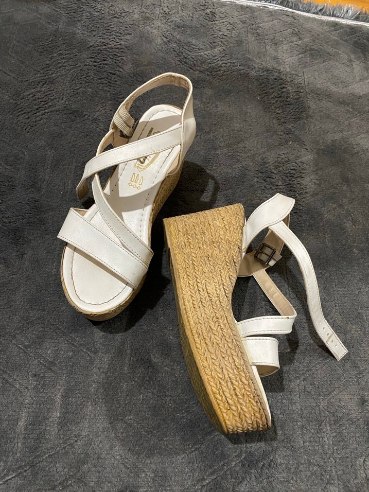 Beyaz dolgu topuklu, tokalı bantlara sahip sandalet. Minimalist ve bohem tarzda, hafif ve desensiz tasarım, rahat günlük kullanım için uygundur.