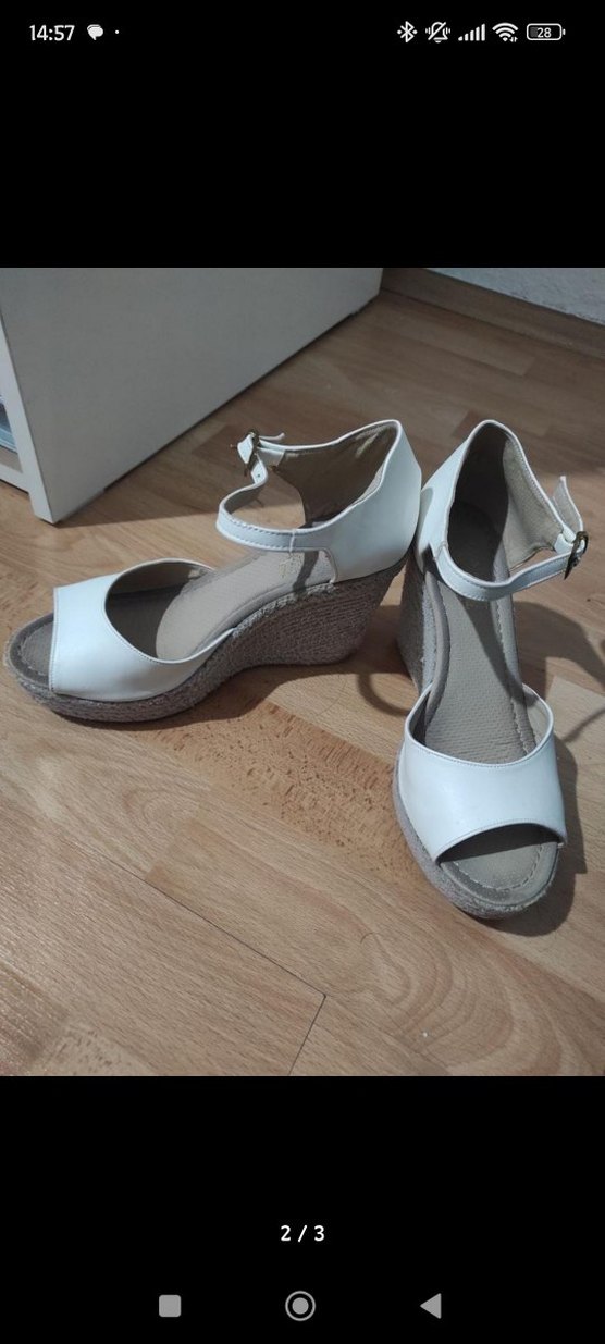 Beyaz dolgu topuklu, tokalı kayışlı, kauçuk malzemeden yapılmış sandalet. Minimalist ve çağdaş tarz, günlük kullanım için uygun.