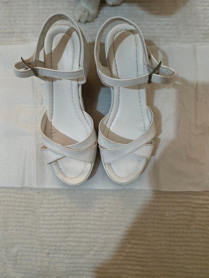 Beyaz renkte, tokalı bantlı, kauçuk malzemeden yapılmış dolgu topuklu kadın sandalet. 9,5-10 cm topuğu var. 1 kere düğünümde giydim çok rahat. Günlük kullanım için uygun.