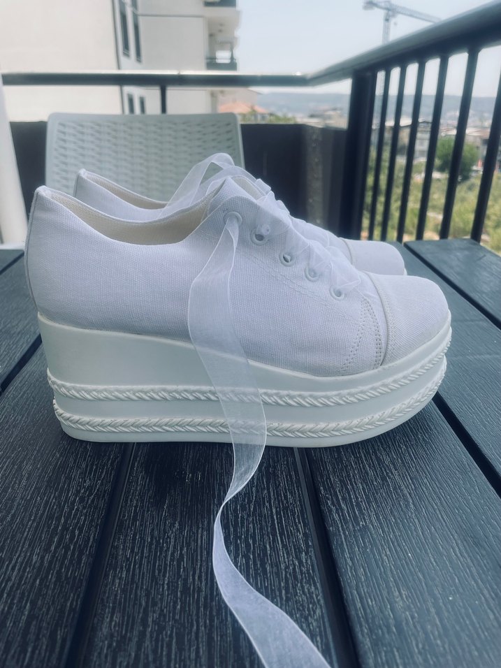 Elastik detaylı, beyaz dolgu topuklu kadın spor ayakkabısı, sade tasarımıyla günlük ve özel davetlere uygundur.
