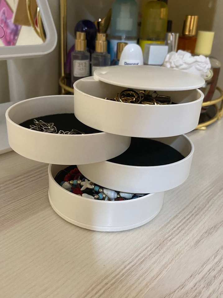 Makyaj ve takılar için beyaz dönerli, çok bölmeli organizer. Kompakt ve kullanışlı tasarım.