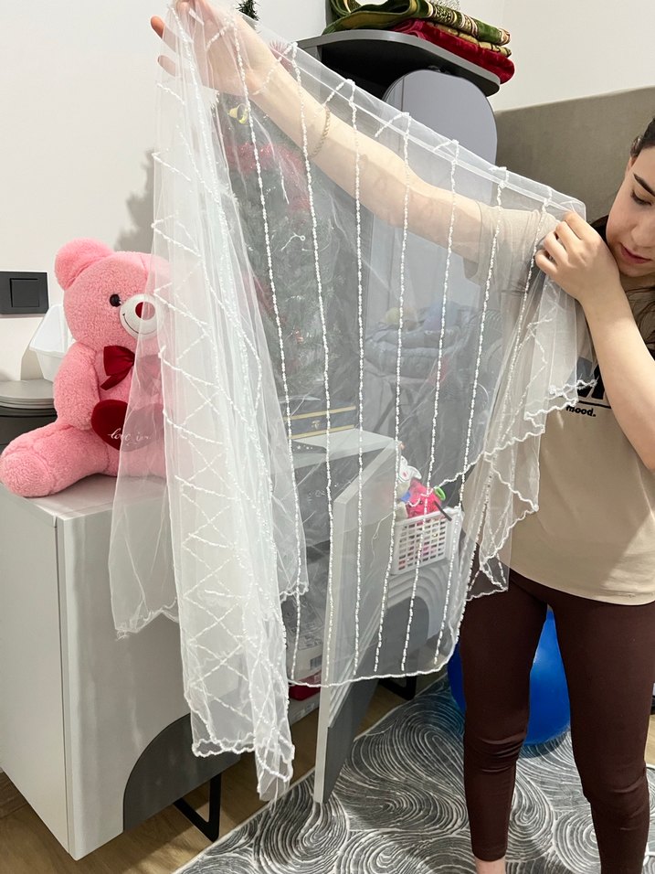 Beyaz renkte, drape detaylı bohem tarzda gelin şalı. İnce desenlerle süslü, trend ve avangart görünüm için ideal. ✨ taşlı gelin duvagı