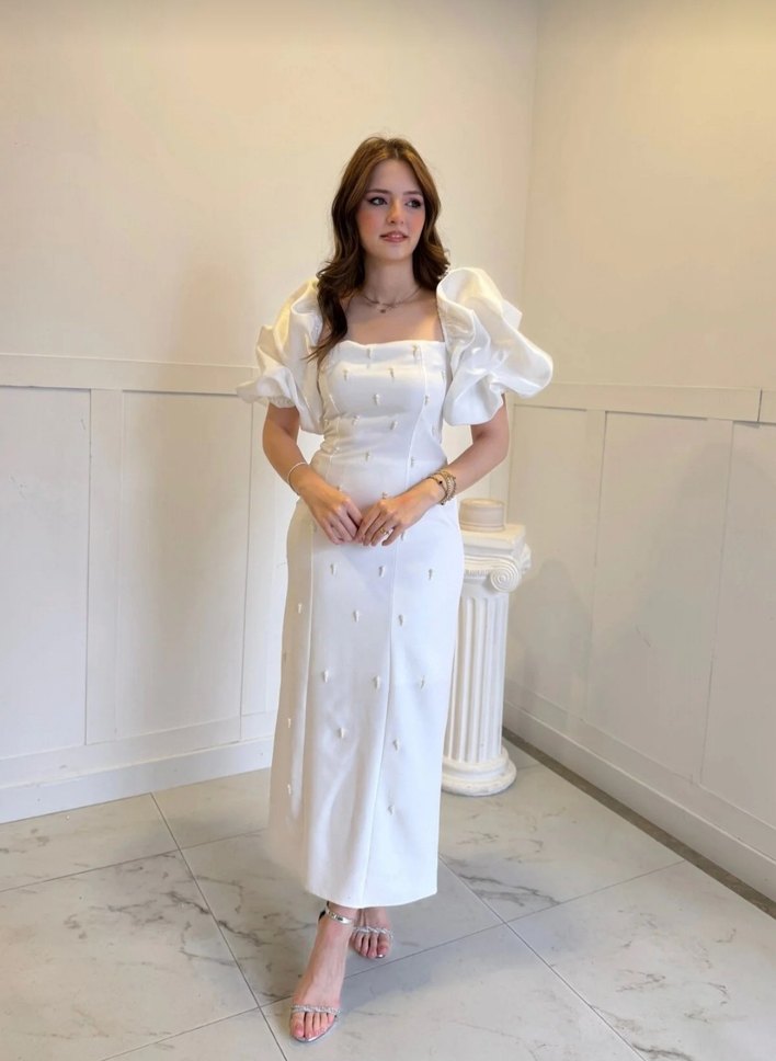 Beyaz renkli, straplez yaka ve drape kısa kollu uzun abiye. Nakış detaylı, klasik Paris esintili şık tasarım.bedenler mevcuttur ✨