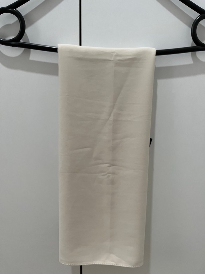 Drapeli beyaz kadın şalı, yumuşak sentetik kumaştan üretilmiştir. Minimalist ve çağdaş tarzda, sade ve temel gardıroplar için uygundur. İpek şal