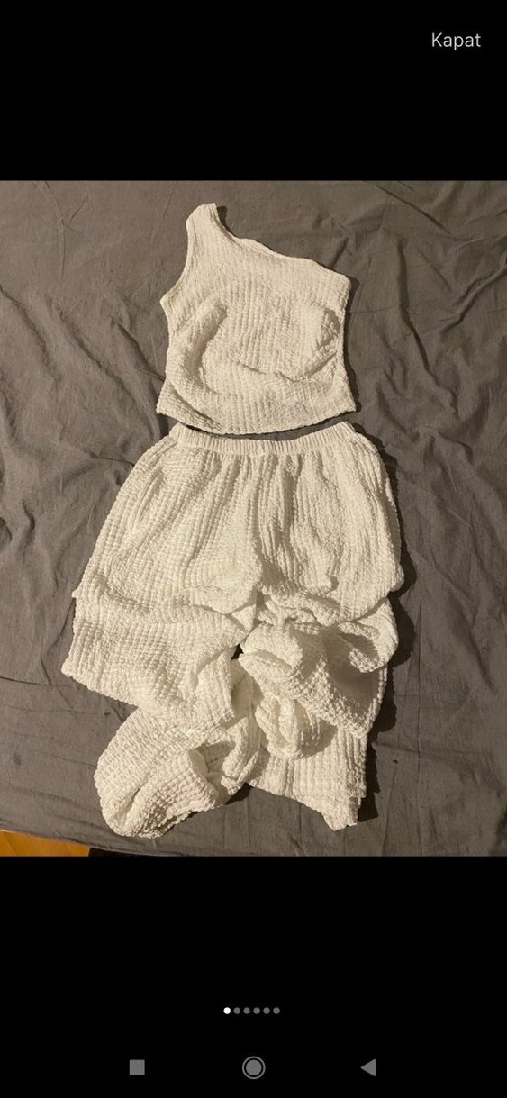 Beyaz renkte, kolsuz drapeli üst ve dokulu pantolondan oluşan ikili takımı. Kumaşı yumuşak ve buruşuk dokudadır.