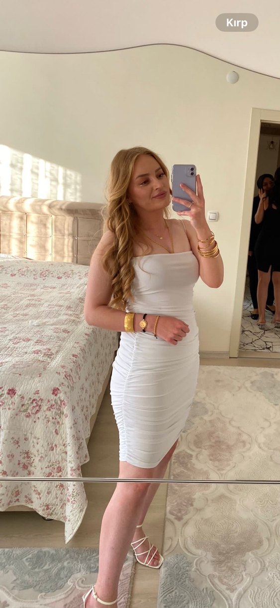 Bir kere giydim detaylı, beyaz, ince askılı ve dar kesim midi elbise, yumuşak sentetik kumaştan üretilmiştir. Romantik akşamlar için uygun.