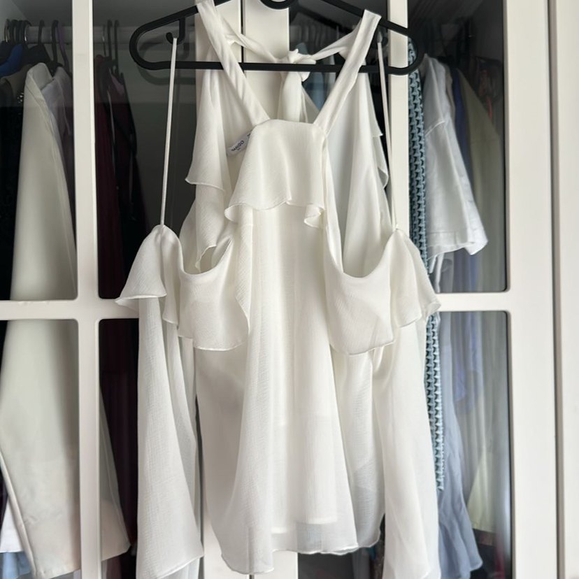 Pamuklu, askılı ve drapeli beyaz bluz ve bol kesim . Bohem tarzıyla günlük ve şık kullanıma uygundur. m ve l bedene uygundur