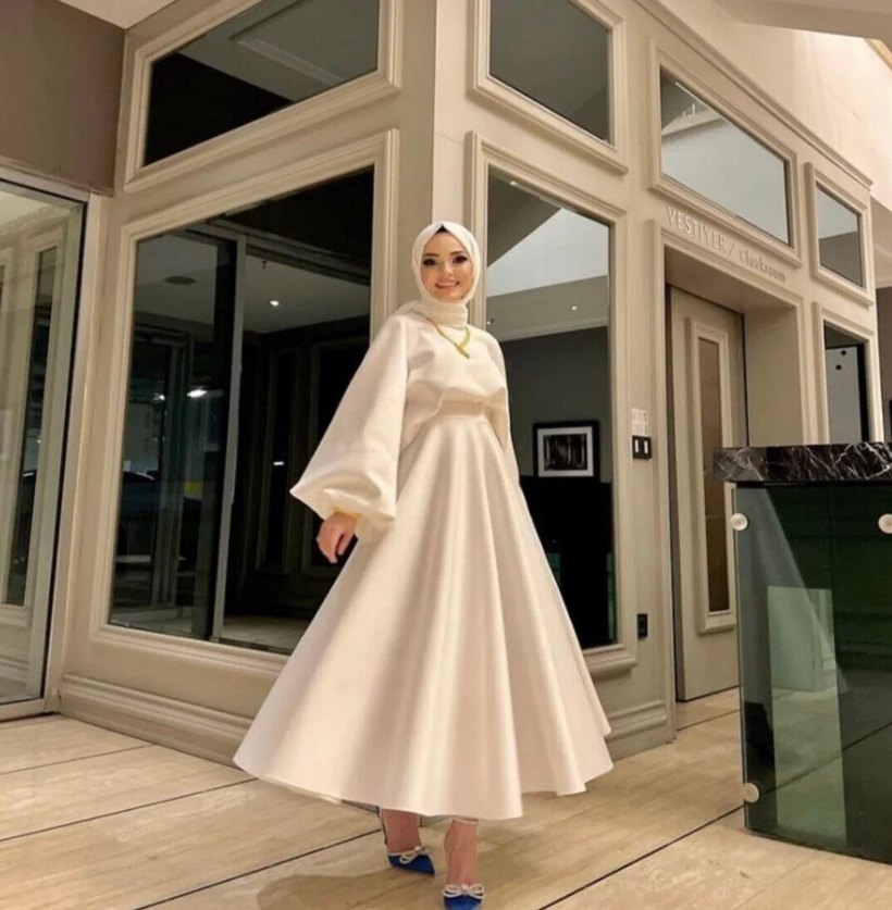 Beyaz uzun elbise, yüksek yakalı ve drapeli uzun kolludur. İpek gibi kumaştan, düzenli kesimdir. Minimalist, modern klasik ve sade tasarıma sahiptir.