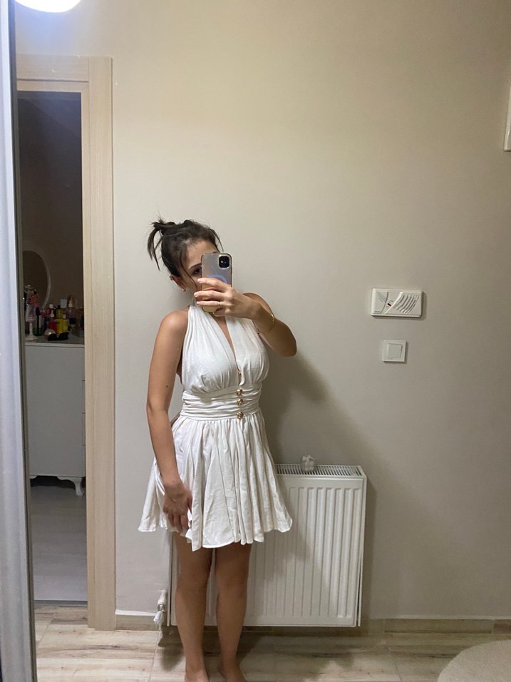 Pamuk kumaştan, drapeli ve halter yaka beyaz mini elbise, ince askıları ve dar kesimiyle minimal ve şık bir sokak stili sunar.