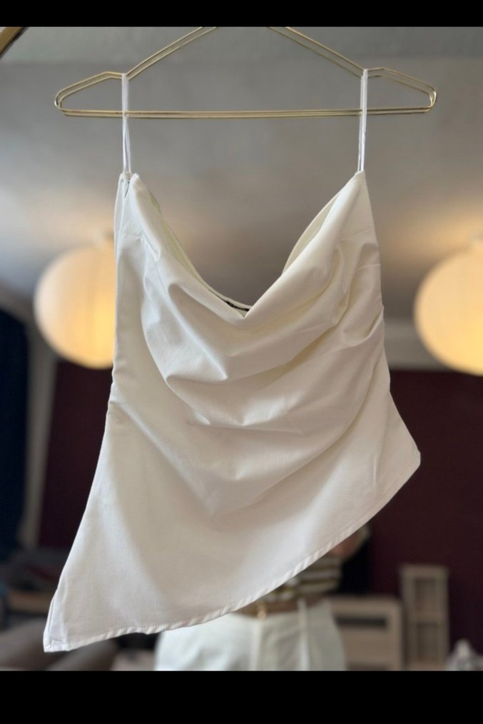 Beyaz keten kumaştan, drapeli yakalı ve fitted kesime sahip, çağdaş midi uzunluğunda ince askılı kadın atlet. Minimalist günlük kullanıma uygun.