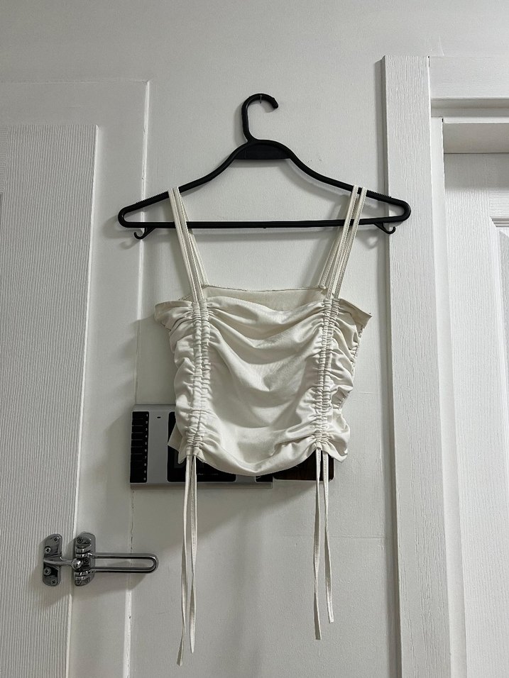 Bu beyaz, ince askılı ve drapeli tasarıma sahip kadın atlet, hafif keten kumaştan üretilmiştir. Straplez yaka ve kısa boyu ile minimalist sokak modasına uygundur.