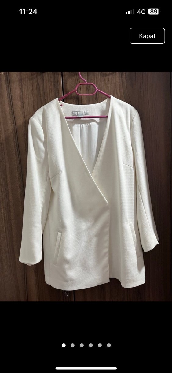Beyaz kadın blazer, keskin yakalı ve drapeli tasarıma sahiptir. Normal kesim, uzun kollu ve midi boydadır. Hafif sentetik kumaştan üretilmiştir. Ofis için uygundur. ✨