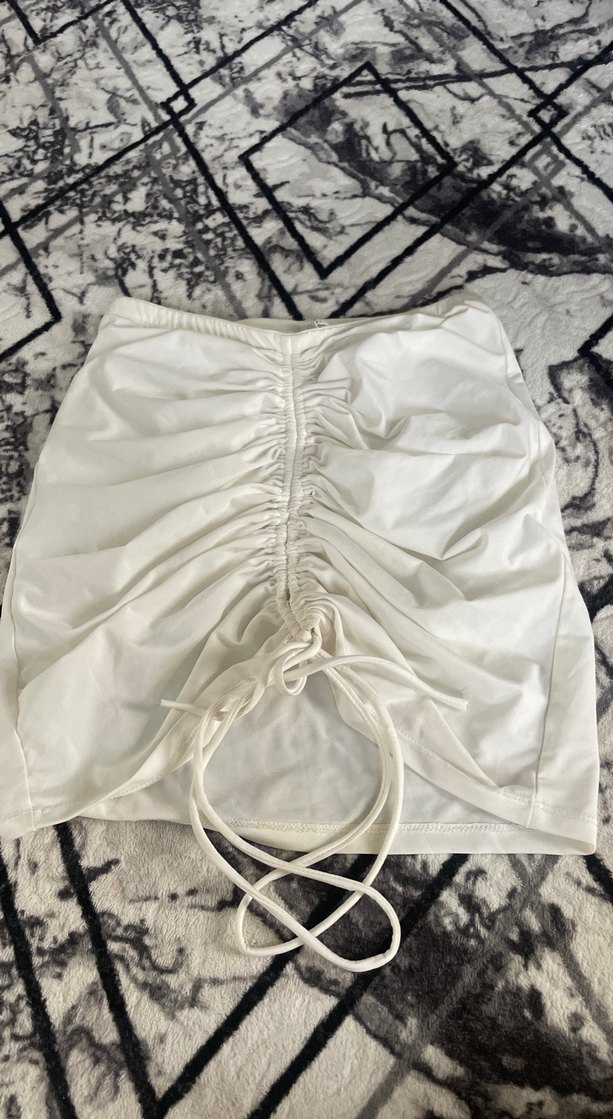 Yumuşak sentetik kumaştan, drapeli ve ayarlanabilir ip detaylı beyaz dar kesim mini etek. Sokak stili ve athleisure için uygun. ⚡