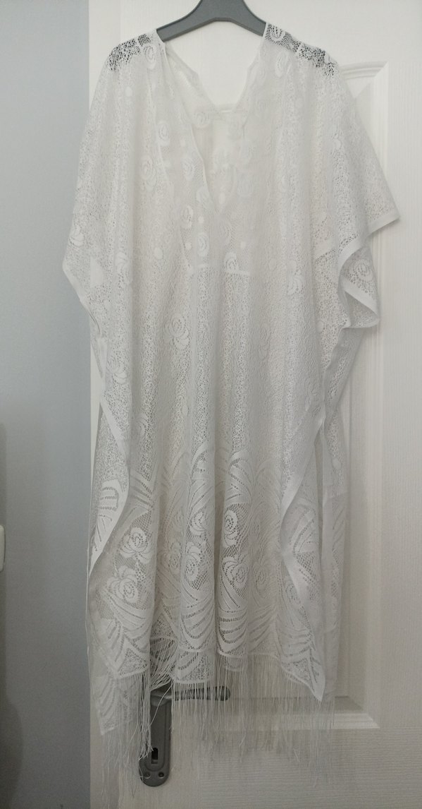 Beyaz renkte, drapeli tasarıma sahip, yumuşak sentetik kumaştan yapılmış kadın pareo