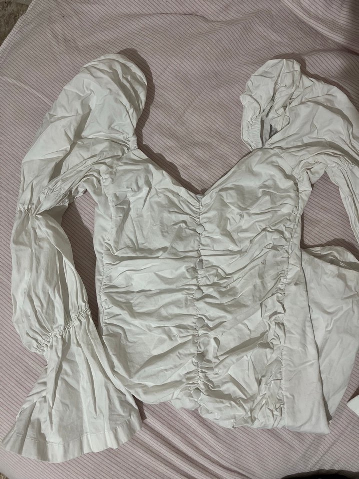 Beyaz keten kumaştan, drapeli uzun kollu, V yakalı ve midi uzunlukta, Paris sokak modasına uygun kadın bluz.