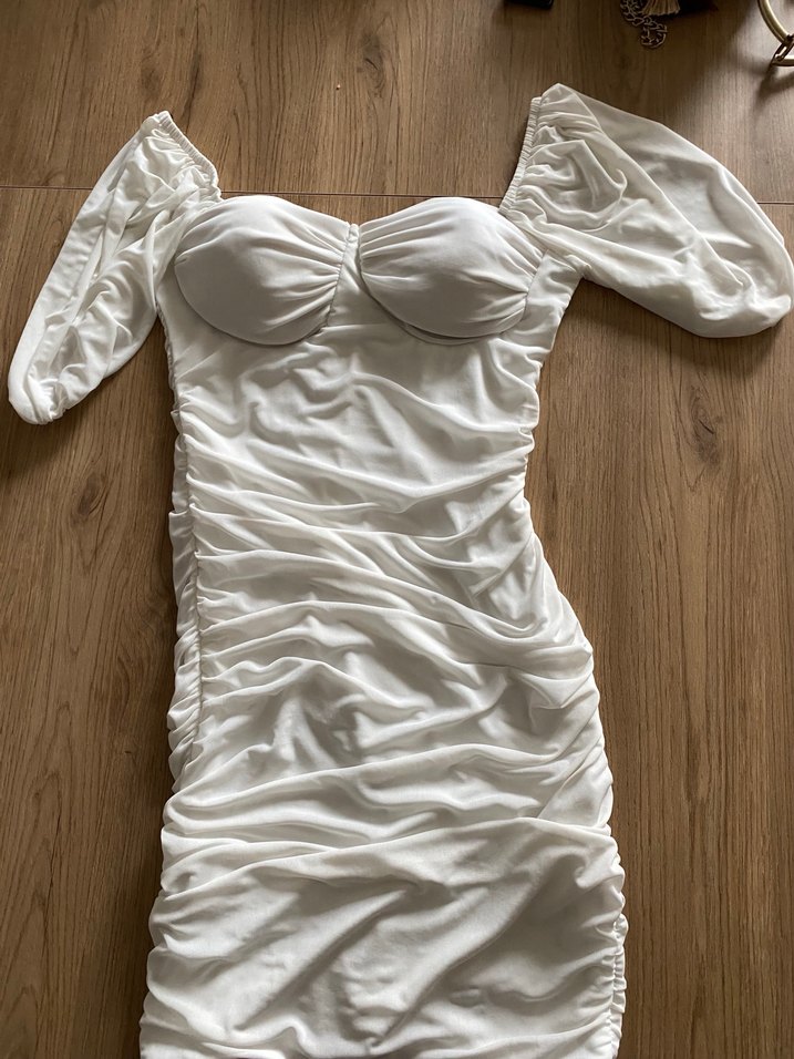 Beyaz, drapeli ve v yaka detaylı, oturan midi abiye elbise. Askılı kolları ve bohem tarzıyla düğünler için uygun.