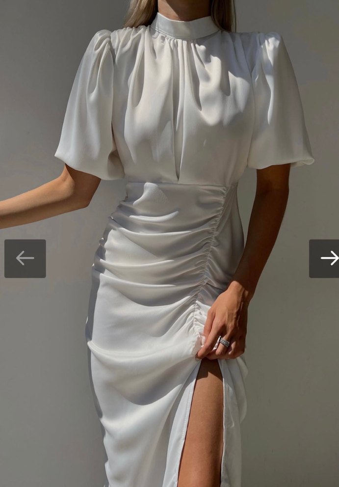 Yüksek yakalı, kısa kollu beyaz midi elbise, drapeli ve vücuda oturan kesimiyle ipeksi kumaştan, düğünler için uygun.