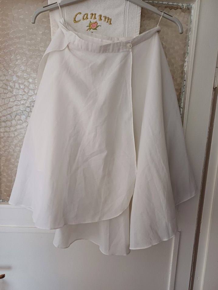 Beyaz renkte, drapeli tasarıma sahip midi uzunlukta etek Yumuşak sentetik kumaştan üretilmiş, bol kesimli ve desen içermeyen klasik stile sahip. Düğünler için uygun, Paris tarzını yansıtan şık bir etek ufak bir defosu var son resimde görünüyor