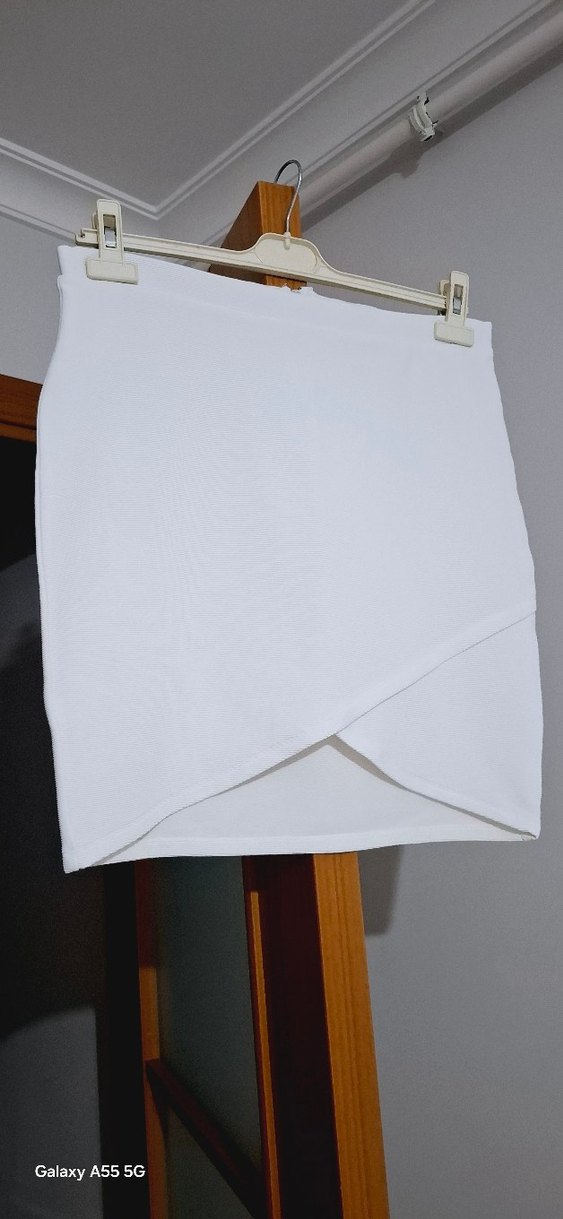 Beyaz renkte, drapeli ve vücuda oturan midi uzunlukta hamile eteği, pürüzsüz sentetik kumaştan üretilmiştir.