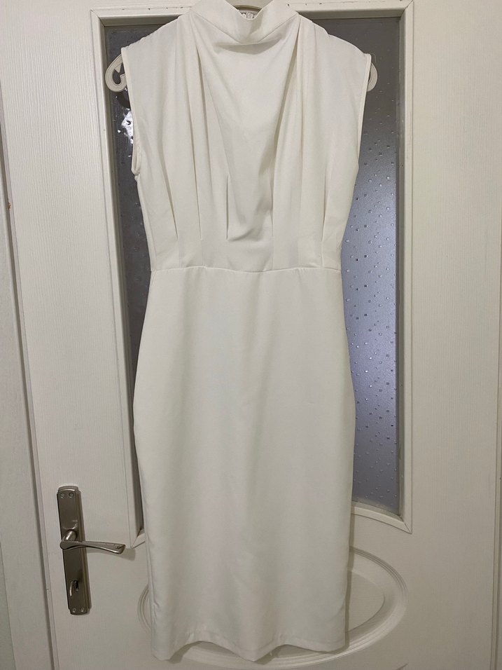 Beyaz, kolsuz ve yüksek yakalı bu drapeli midi elbise, modern klasik tarzıyla ofis kullanımı için uygundur.
