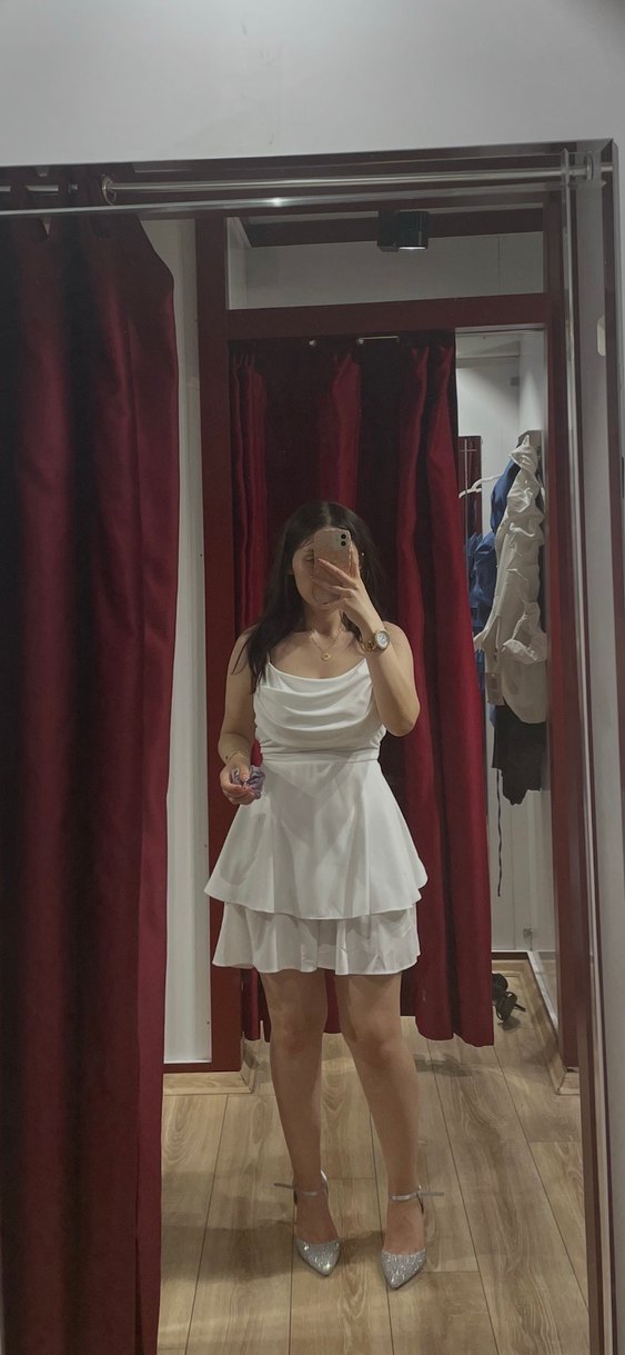 Beyaz, drapeli straplez yaka ve kat kat etek detaylı, vücuda oturan midi elbise, şık ve cesur parti kombinleri için uygundur. 1 kere mezuniyetimde giydim.