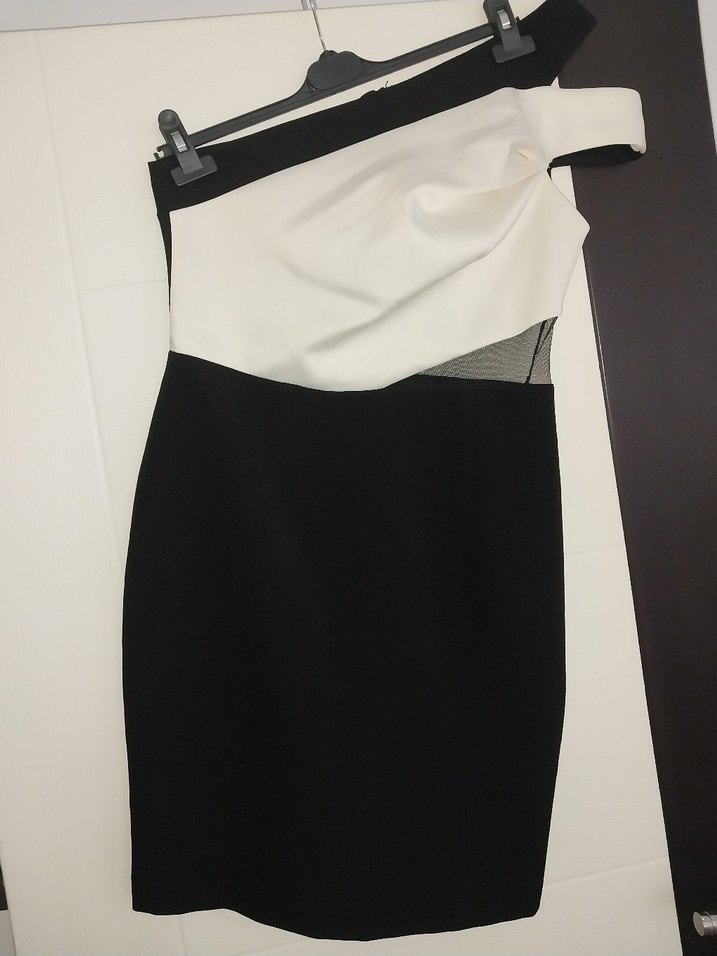 Fitted kesim midi elbise, straplez yaka ve beyaz drapeli detaylarla modern Paris tarzı sunar. Beden M
