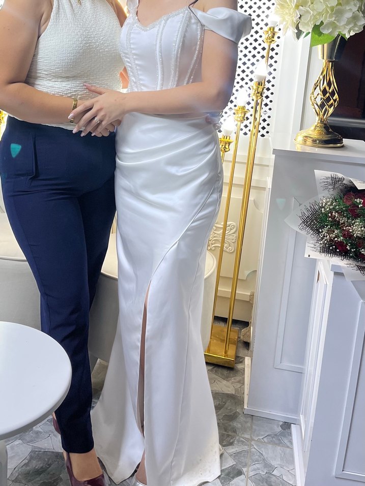 Beyaz, drapeli, straplez ve askılı kolları olan, modern klasik Paris tarzı midi boy, vücuda oturan elbise. Düğün ve nişan için uygundur. Bir kere giydim