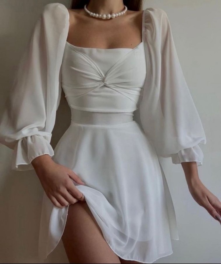 Drapeli detaylara ve askılı kollara sahip beyaz, straplez, vücuda oturan mini elbise. İpek gibi kumaştan, modern klasik ve Paris esintili, düğün için uygun.