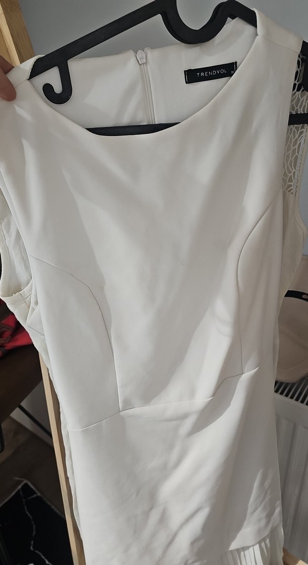 Bu beyaz, fitted mini elbise, yuvarlak yaka ve kısa kolludur. Drapeli tasarımıyla minimalist sokak stilini yansıtır. Günlük kullanıma uygundur.