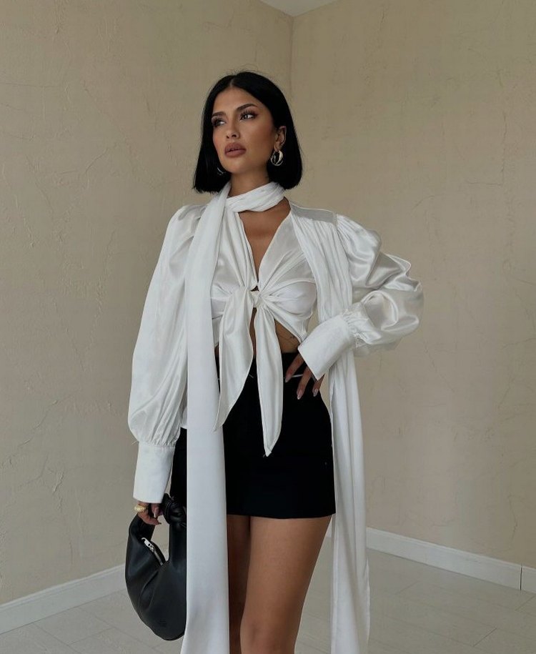 Beyaz, saten dokulu, uzun kollu ve drapeli detaylı, bol kesim mini bluz. Parlak yüzeyiyle cesur ve şık bir sokak stili sunar.