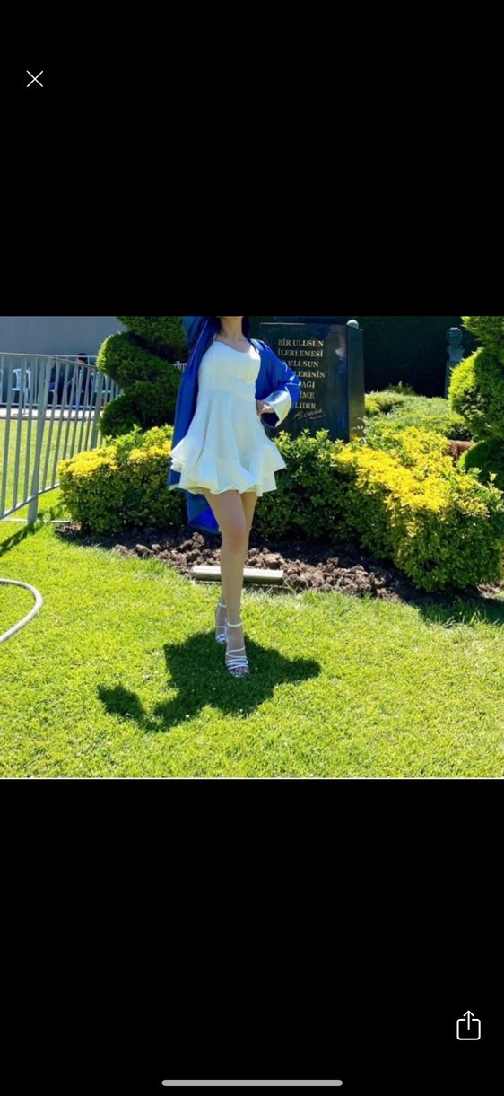 Drapeli ve askısız beyaz mini elbise, dar kesimi ve parlak kumaşıyla açık hava mezuniyetleri için şık bir sokak stili sunar.