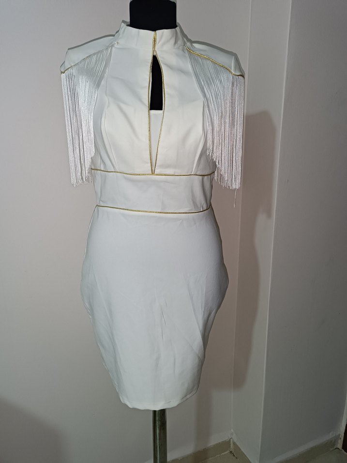 Beyaz mini boy elbise, V yakalı ve drapeli detaylara sahiptir. Nakışlı, askılı omuzları ve regular kesimi ile çağdaş ofis şıklığı sunar. ✨ 40 bedendir