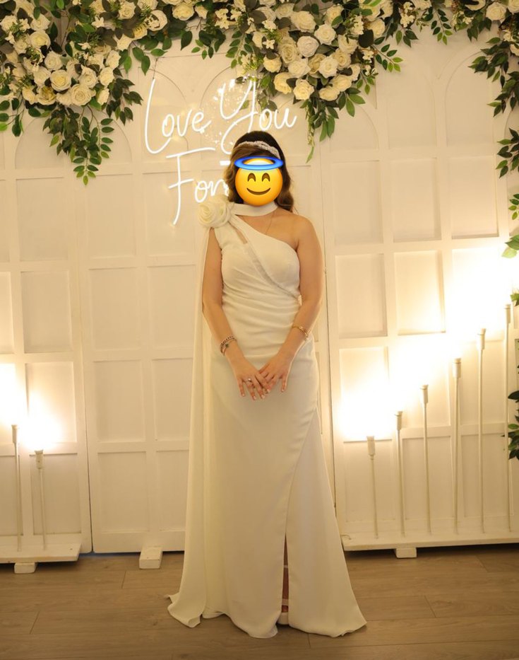 Nişanımda giymek için aldım, straplez, omuzdan çiçekli ve pelerinli, taş detaylı yırtmaçlı drapeli beyaz balık tipi uzun elbise