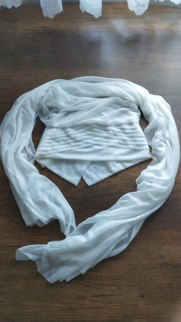 Beyaz, simli, kadına özel, hafif ve drapeli tasarımlı, minimalist bohem tarzına uygun şallı bone. Özel dikimdir. Sadece bir defa kullanıldı.