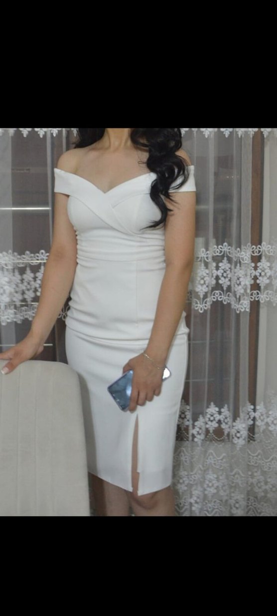 Beyaz kalem elbise, straplez yakalı, drapeli detaylı ve midi boyda yırtmaçlıdır. Pürüzsüz sentetik kumaştan üretilmiştir. Düğün , söz ve nişan için uygundur.