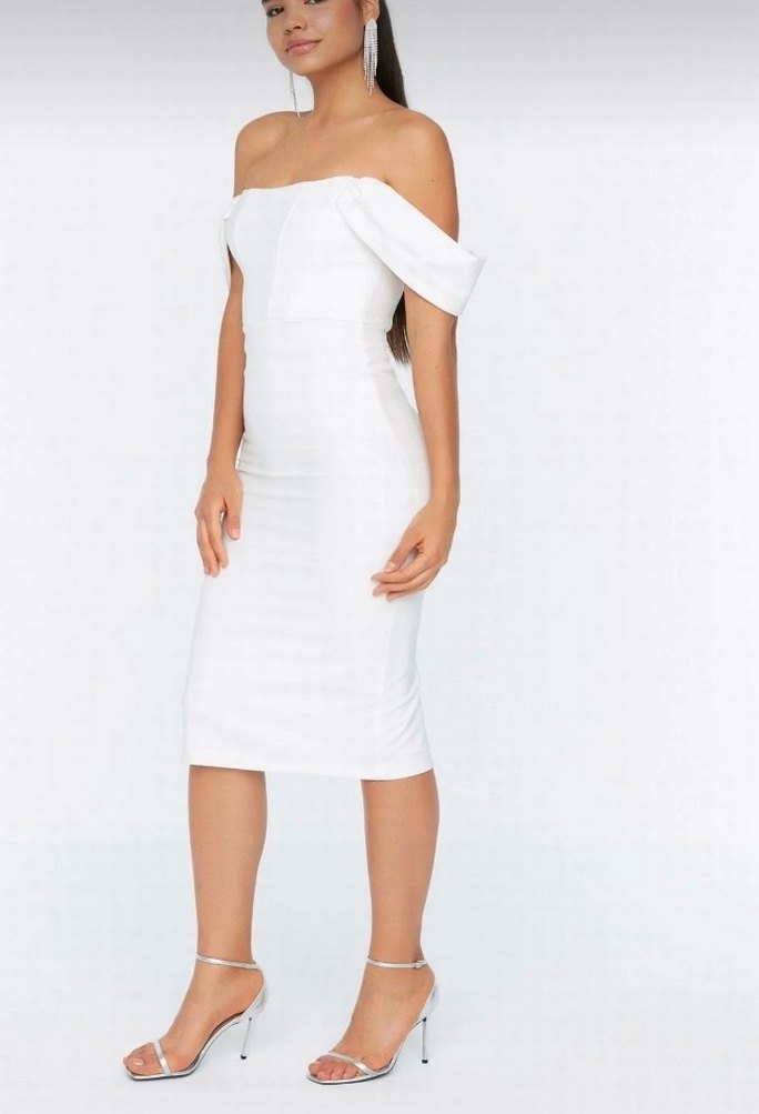 Beyaz, straplez ve drapeli kalem elbise. Midi boyda sadece 1 defa kullandım nikahımda