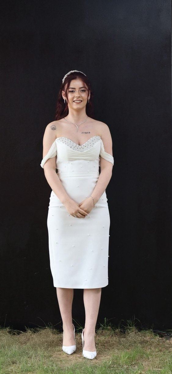 Beyaz renkte, straplez yaka ve drapeli askılı kollara sahip, vücuda oturan midi boy elbise. Düğün için şık ve gösterişli bir tercihtir. (Taç, eldiven ve ayakkabısı(38) ile birlikte gönderim sağlanacaktır.)