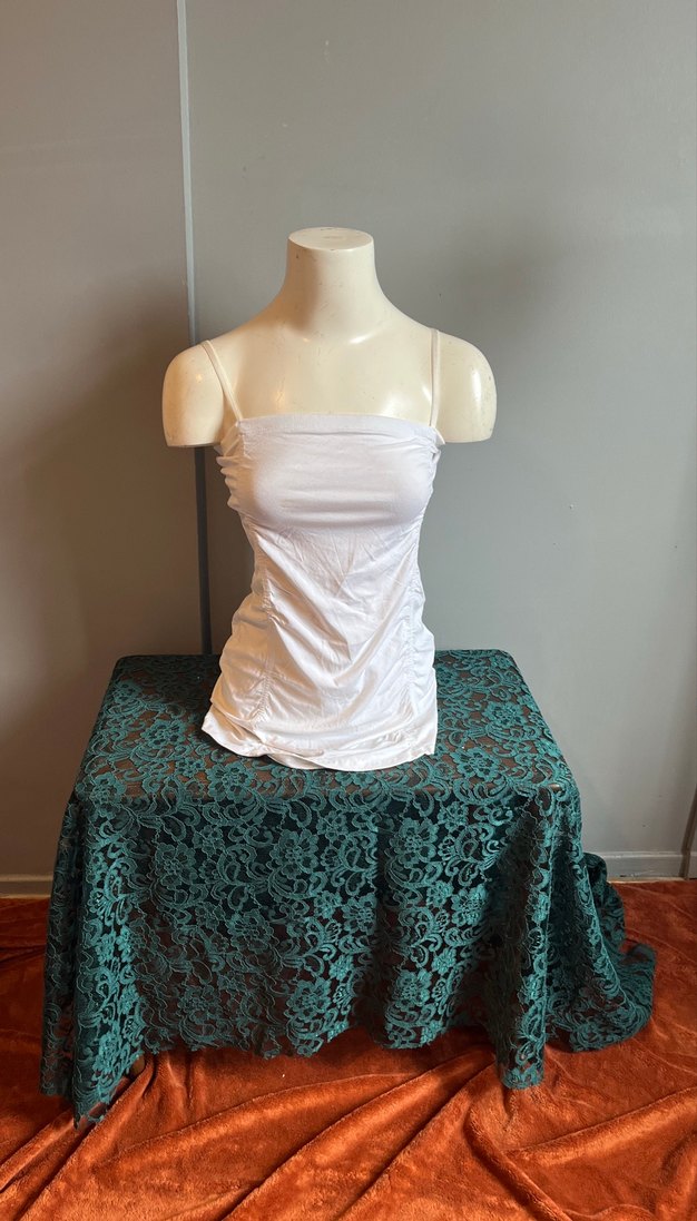 Drapeli, straplez, saten görünümlü beyaz hamile tunik. Kolsuz, midi boy, bohem tarzda düğünlere uygun.