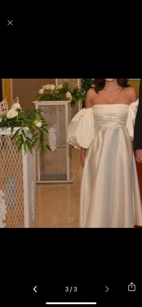 Beyaz renkte, drapeli ve straplez yakalı, midi ve bol kesim abiye elbise. Modern klasik tarzda, desensiz ve hafif kumaş kullanılmış. Sadece bir kere nişanımda giydim. Kırık beyaz rengi. Bir kere kuru temizleme ihtiyacı var o yüzden fiyatı böyle