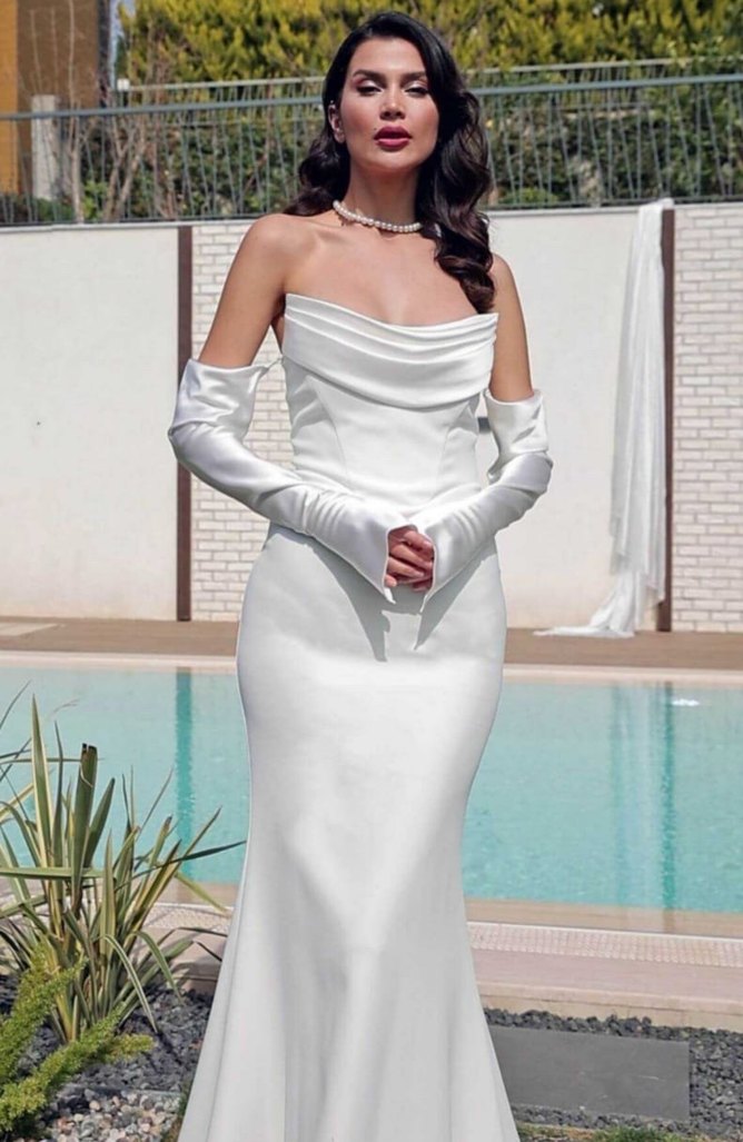 Drapeli detaylı, straplez beyaz, parlak yüzeyli, uzun ve vücuda oturan abiye elbise. Modern klasik tarzda, kolsuz ve düğün için uygun 1 defa giyildi
