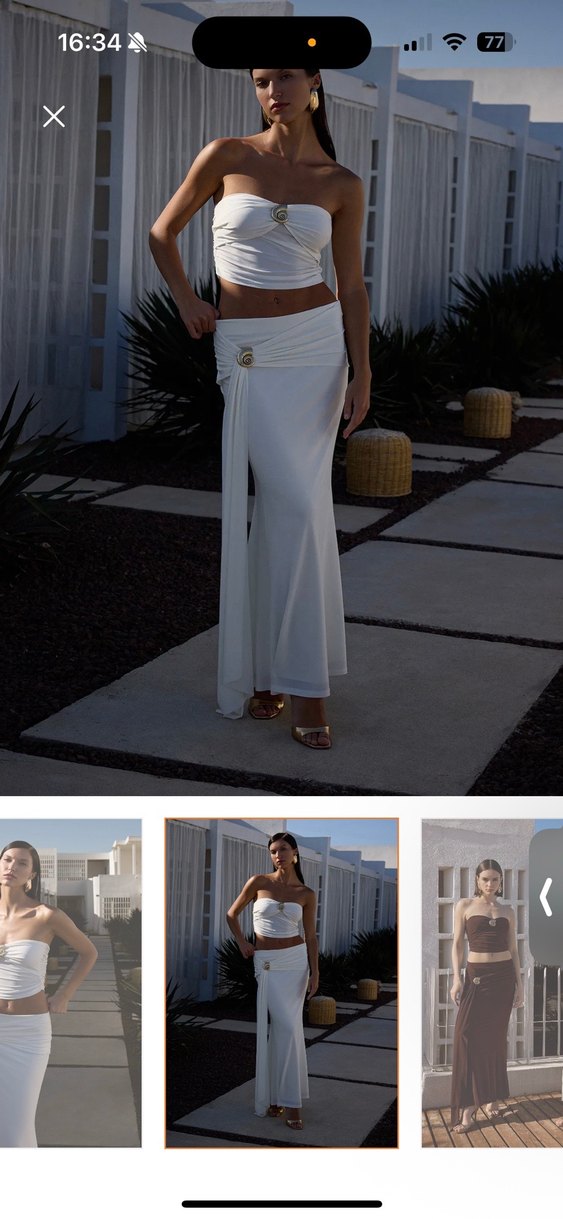 Drapeli, straplez, uzun ve ince kesim elbise. İnce, beyaz ve ipeksi dokuda, minimal tarzda, düğün için uygun. Kollu değil.