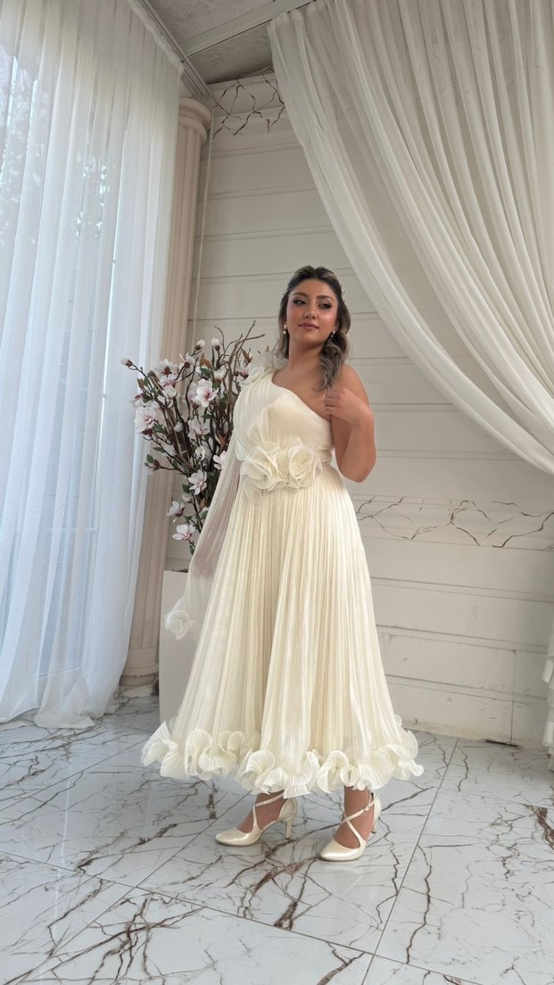Beyaz straplez, drapeli ve bol kesim kadın uzun elbise. Nişanımda kullandım yalnızca 1 defa kullanıldı kuru temizlemesi yapıldı. Çok rahat bir elbise 38-40-42bedene uygun. Ankara karum by belgin mağazasından aldım haziran ayında