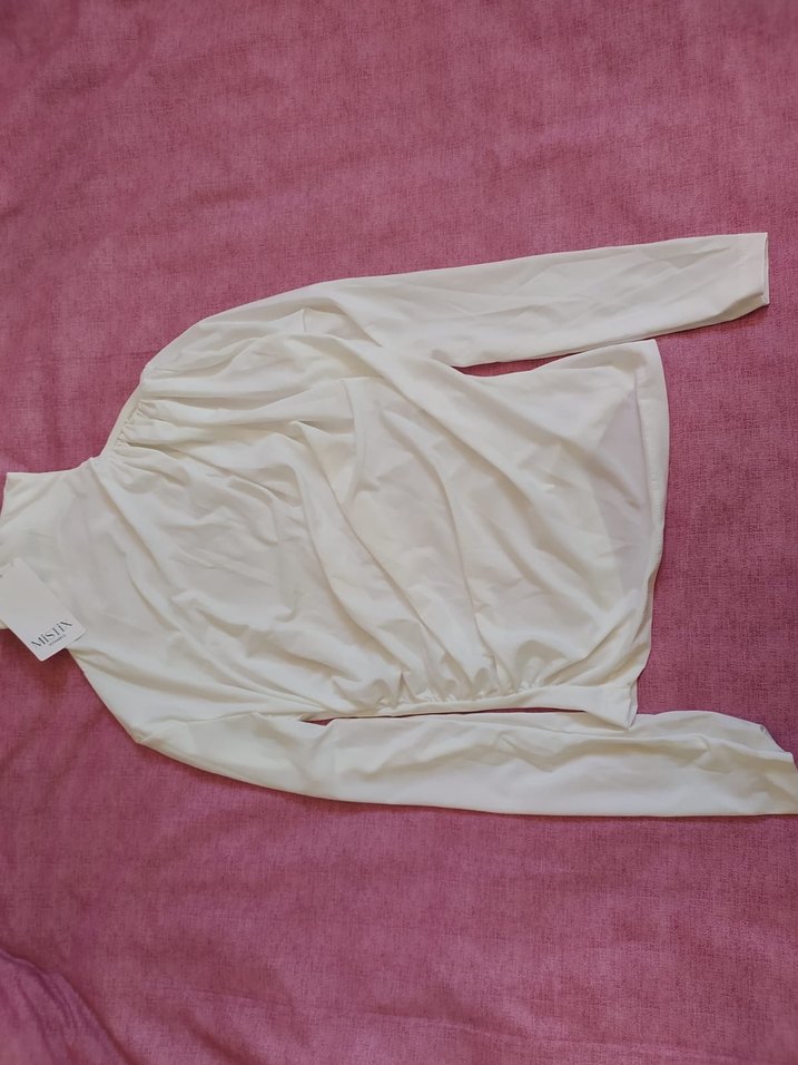 Drapeli ve straplez yaka detaylı, uzun kollu beyaz bluz, şık ve minimal bir görünüm sunar. Sentetik kumaştan üretilmiştir. ✨